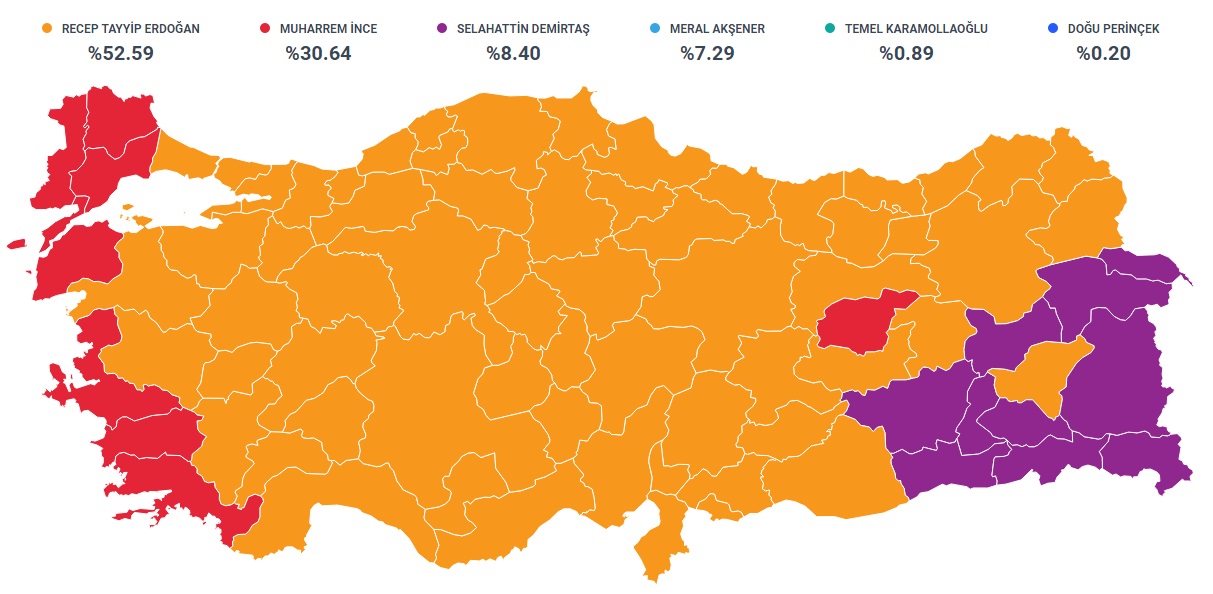 Recep Tayyip Erdoğan; yüzde 52.59 ile 26 milyon 324 bin 482 oy,