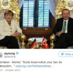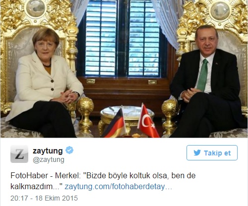 Zaytung, the Onion-like satirical Turkish news portal, posted a fake statement from Merkel, saying: “If we had an armchair like this, I wouldn’t leave it either.”