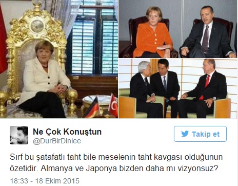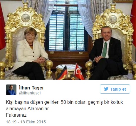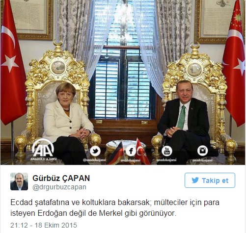 Turkish President Recep Tayyip Erdoğan hosted German Chancellor Angela Merkel on Oct. 18 to discuss financial aid to Syrian refugees in Turkey. However, the gaudy throne-like armchairs in the hall where Erdoğan spoke to Merkel have created a storm on social media. Click through for a compilation of funny responses: