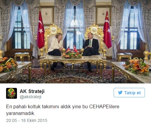 A parody account called AK Strateji (referring to the Justice and Development Party, AKP) touched upon the thorny relationship between the AKP and the main opposition Republican People’s Party (CHP): “We bought the most expensive sofa set but still couldn’t woo the supporters of the CeHaPe,” the tweet read.