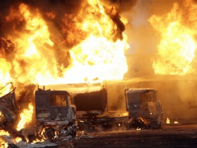 Hundreds of people crowded together as soldiers and emergency workers lifted bodies into ambulances and police trucks. The fuel tanker was a pile of smoldering ash, twisted metal and melting tyres.