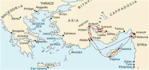 The first journey of Paul started in Anatolia and took him to Cyprus and back to Anatolia. Paul and the group he led traveled from Antioch, located in what is now Antakya province in modern southern Turkey, to Perga, located in what is now Antalyaprovince. The group then sailed to Cyprus from Perga. Paul arrived at Salamis in northern Cyprus, an ancient city that was located north of where Famagusta is today. From Salamis, Paul traveled to the southern part of the island and then returned to Perga. His first journey ended in Antioch, where he returned from Perga.