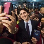 Canadian Prime Minister Justin Trudeau poses for selfies with workers before he greets refugees from Syria at Pearson International airport, in Toronto, on Thursday, Dec. 10, 2015. (Nathan Denette/The Canadian Press via AP)