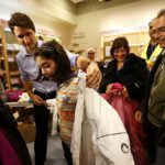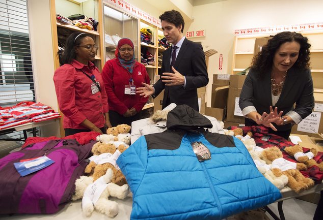 Canadian Prime Minister Justin Trudeau, centre, looks over winter clothing which will be handed out to arriving Syrian refugees before arrival at Pearson International airport, in Toronto, on Thursday, Dec. 10, 2015. (Nathan Denette/The Canadian Press via AP)